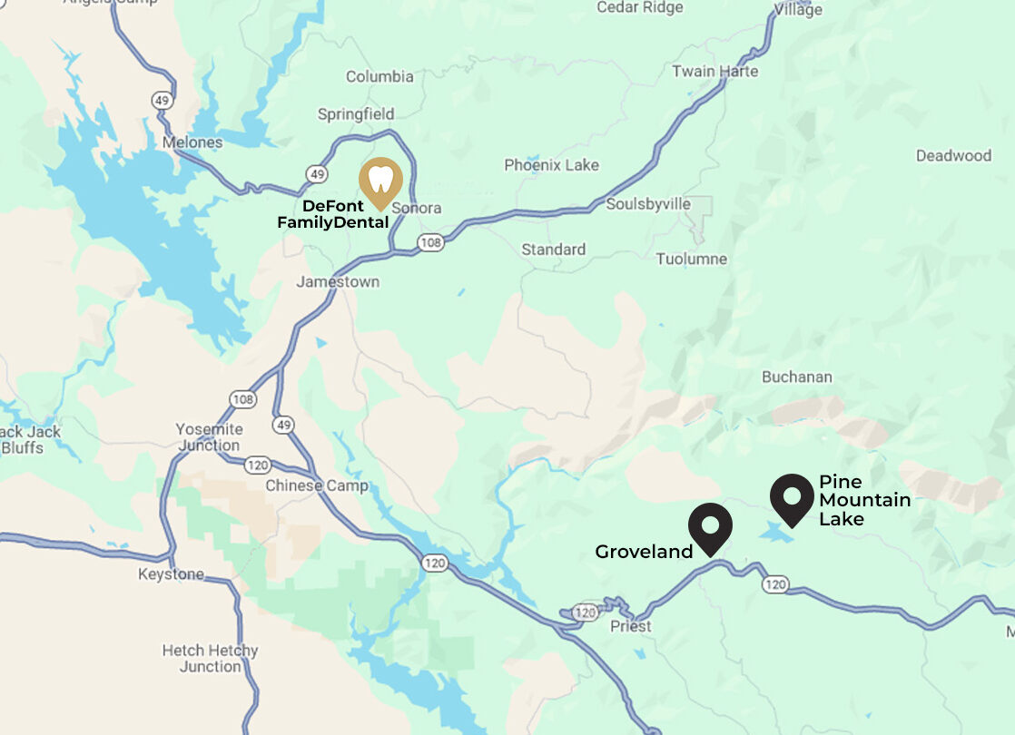 Along with Sonora and other surrounding areas, DeFont Family Dental always welcomes patients from Groveland, CA. With an easy drive on CA-120 W, DeFont Family Dental is located in Sonora around the Dragoon Gulch Trail. We have convenient parking and flexible appointment hours to accommodate our patients’ busy schedules.